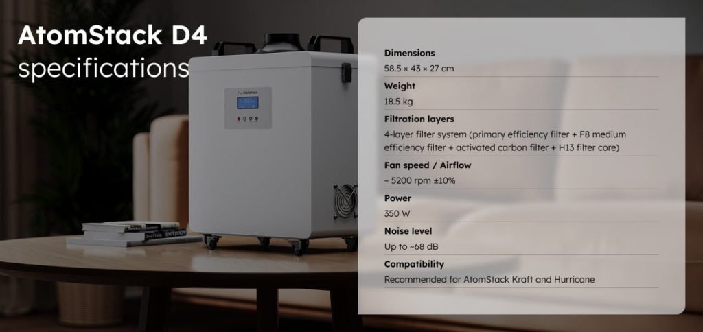 L’AtomStack D4 è progettato per una qualità dell’aria superiore. Il suo avanzato sistema di filtraggio a 4 strati intrappola ed elimina fumo, odori e altre particelle nocive con un’efficienza di purificazione fino al 99,5%. Questa potente filtrazione garantisce un ambiente di lavoro più sicuro e piacevole.