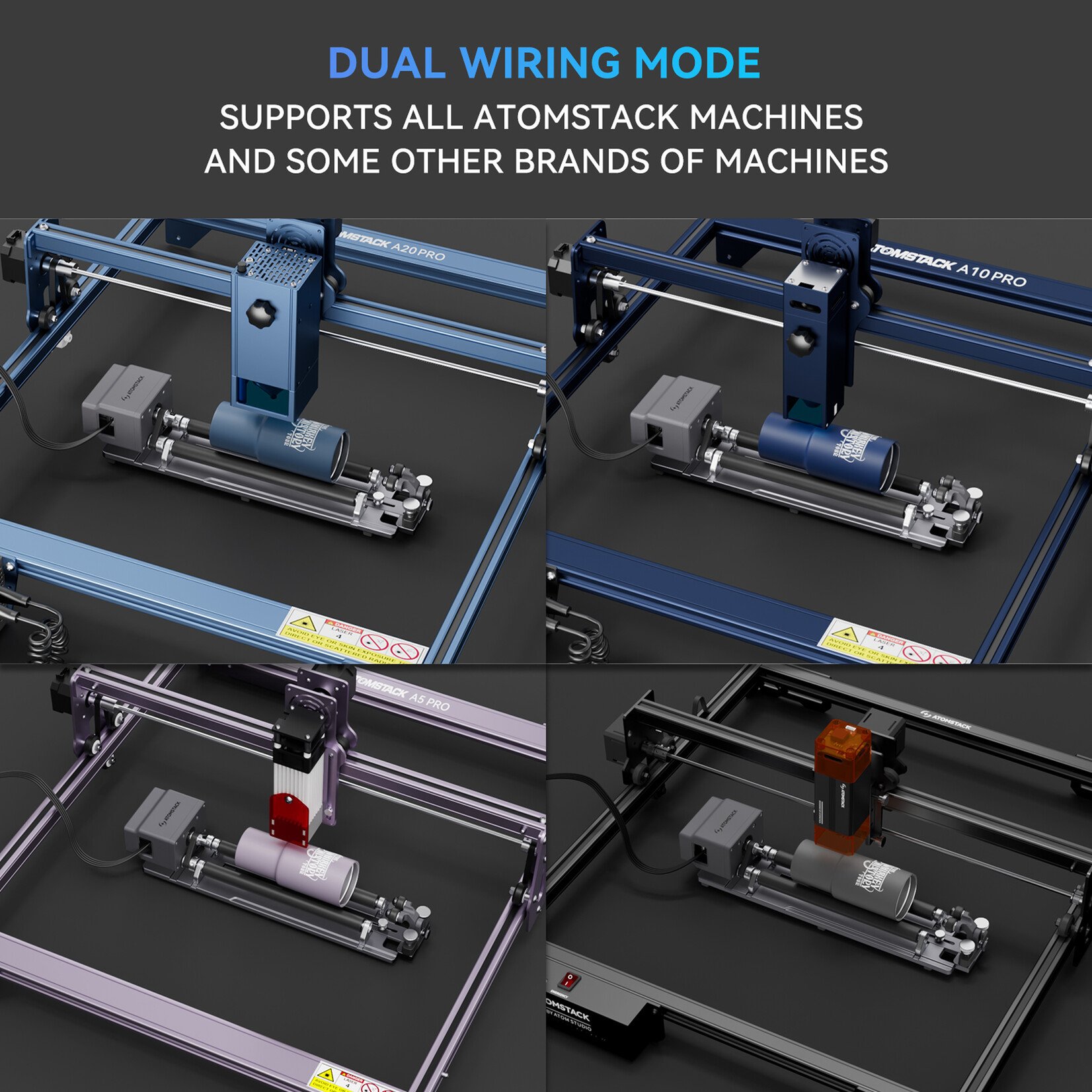 - Dispone di un chip di riconoscimento per una perfetta integrazione con AtomStack Studio, eliminando la configurazione manuale. Completamente compatibile con LightBurn.
