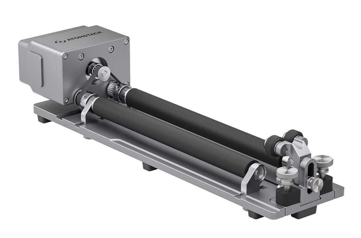 Il mandrino a rulli AtomStack R6 è dotato di rulli paralleli regolabili per trattenere e ruotare in modo sicuro oggetti cilindrici, come bottiglie e bicchieri, garantendo un’incisione fluida e precisa su superfici curve.