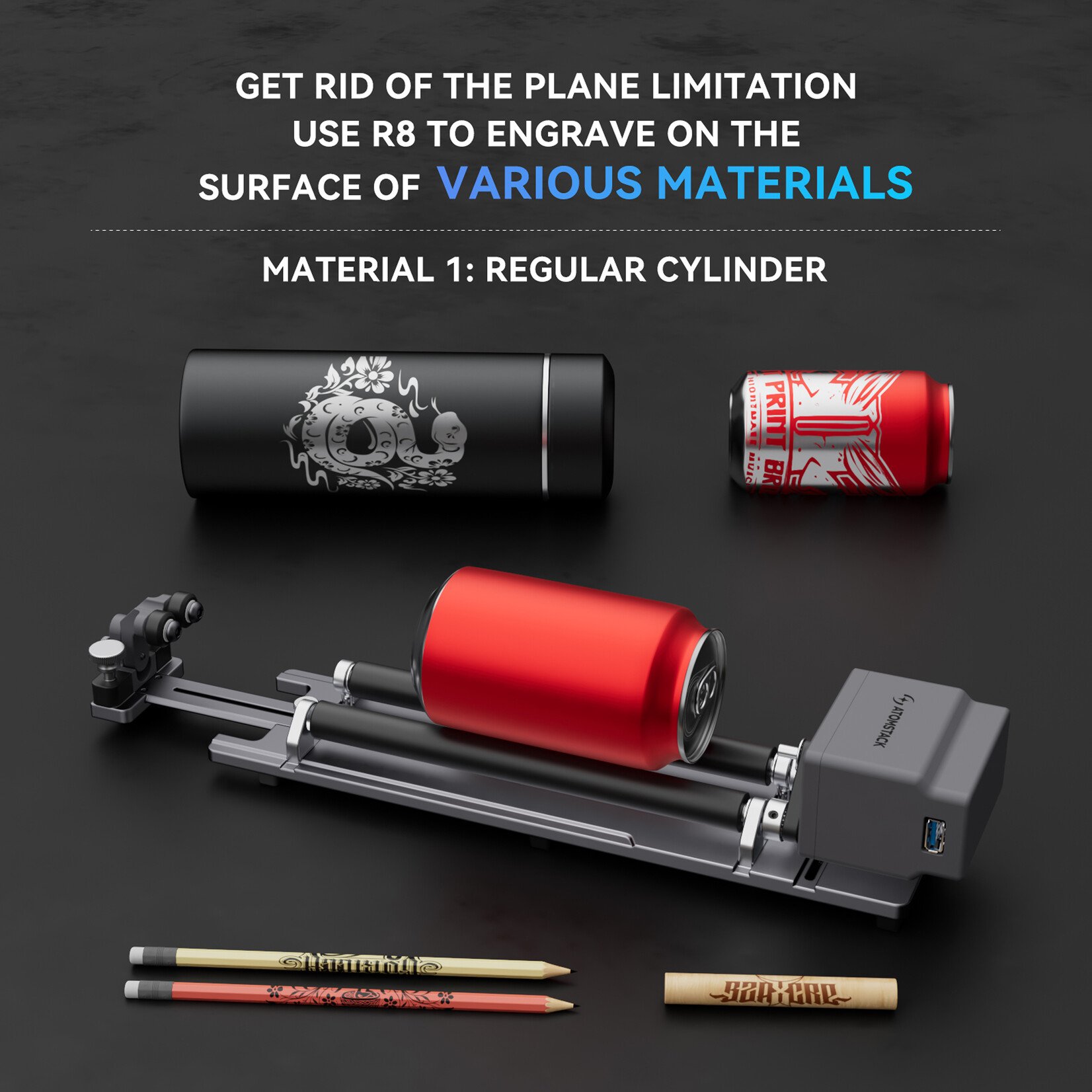 - Ideale per incidere sia oggetti cilindrici regolari che leggermente irregolari (come thermos, mazze da baseball e bicchieri da vino).
