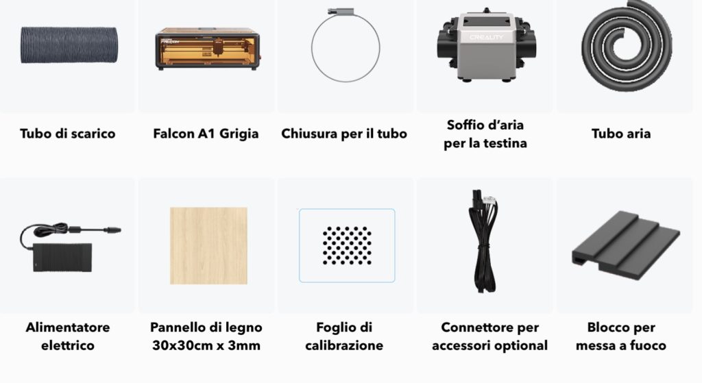La Creality Falcon A1 viene consegnata già pronta a lavorare. dovete solo posizionarla, collegare i cavi e iniziare a creare.